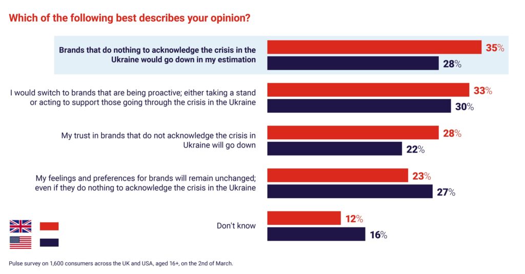 In all, “The Ukraine crises requires brands and companies to take a stand,” Andrea says. “It affects the Advocacy pillar specifically. The vast majority of consumers we interviewed in the US and UK are expecting brands to say and do something about the situation. We know from other studies, too, that the majority of consumers expect a brand and company to react very rapidly to something major impacting society. Not taking a position can be harmful as consumers are observing and judging what brands and companies are saying and doing.”
