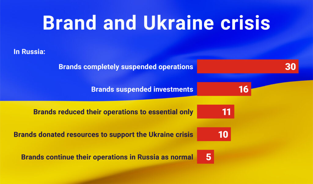 Some brands have taken more than one action. However, 5 brands decided to continue their operations in Russia, as normal. These actions have continued to change and develop over the weeks, as the crisis has continued.