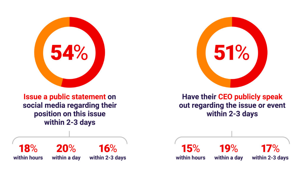 According to the Edelman Trust Report 2021, 54% of consumers expect at least a public statement within 2-3 days of an issue emerging.