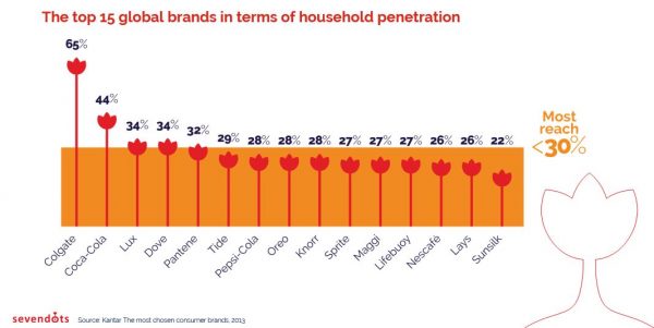 Aside from Colgate (65%) and Coca-Cola (44%), the majority of the brands above struggle to achieve even 30% household penetration. For Colgate, the global leader in toothpaste, one of the primary reasons for their Brand Penetration success can be attributed to their one-brand consistency across all geographies and thus creating a “globalized asset”.